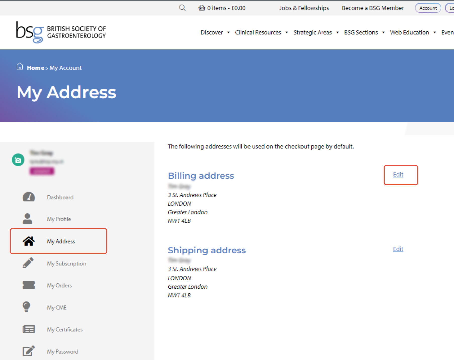 To update your address(es), log in to your account and click on "My Address" on the left hand side navigation as seen in the example below. Then click on "Edit" on the right hand side to make changes, make sure you click save to confirm.